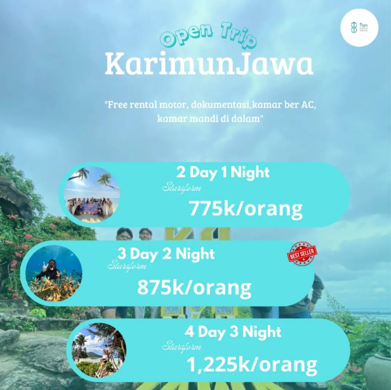Liburan hemat dan seru ke Karimunjawa, tersedia pilihan 2D1N, 3D2N, atau 4D3N dengan fasilitas lengkap dan motor gratis.